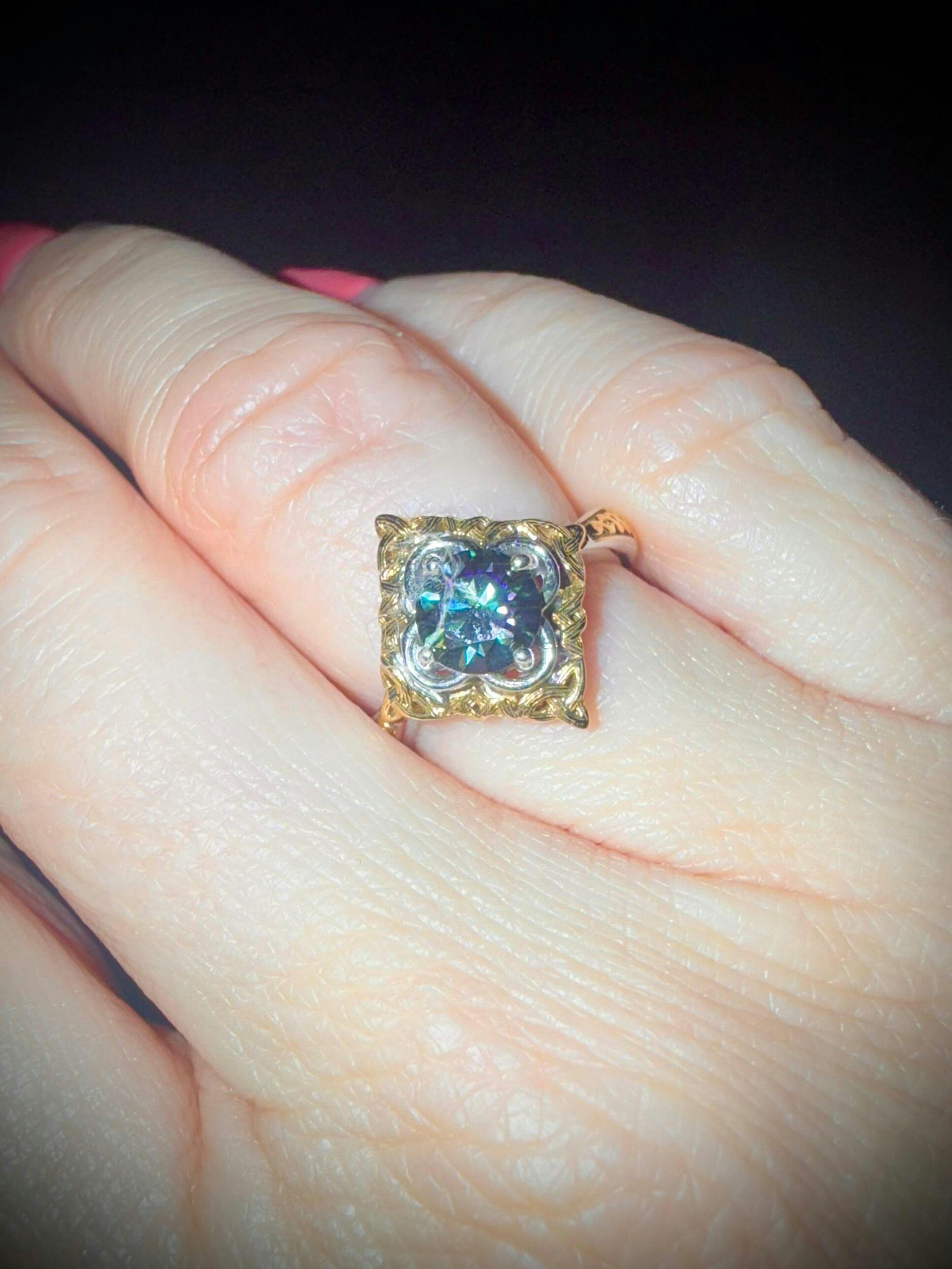 Materials: Rhodium Sterling Silver And 10k Yellow Gold with Blue Moissanite.