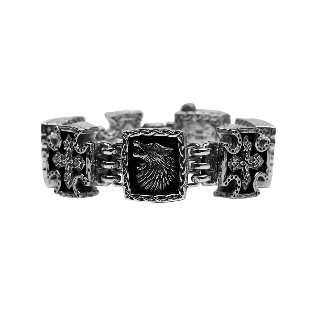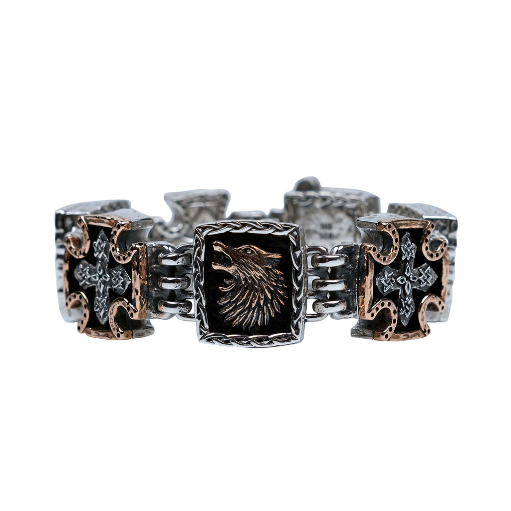 Silver or Silver and Bronze Wolf & Cross Bracelet Large