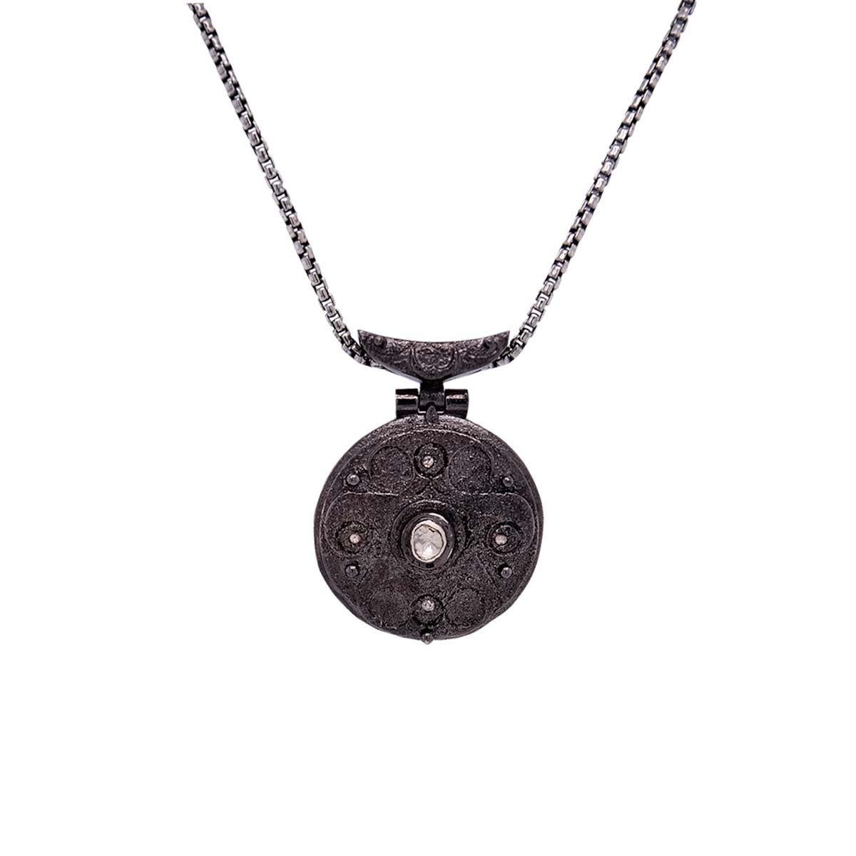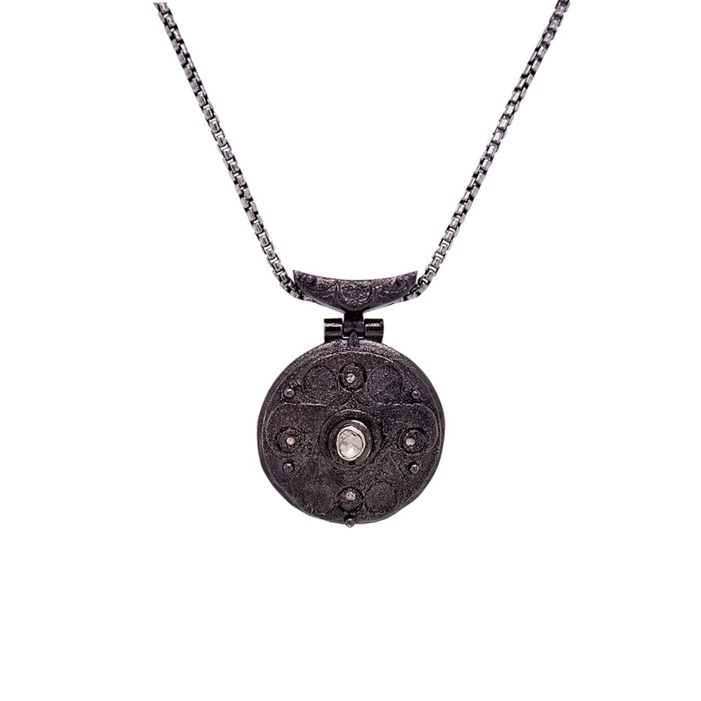Silver and Black Rhodium Raw Diamond Round Shield Pendant