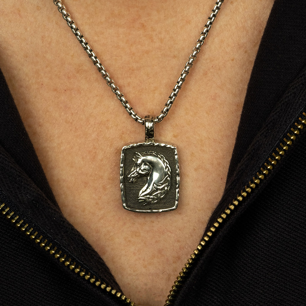 This pendant comes on an oxidized medium Venetian style chain.