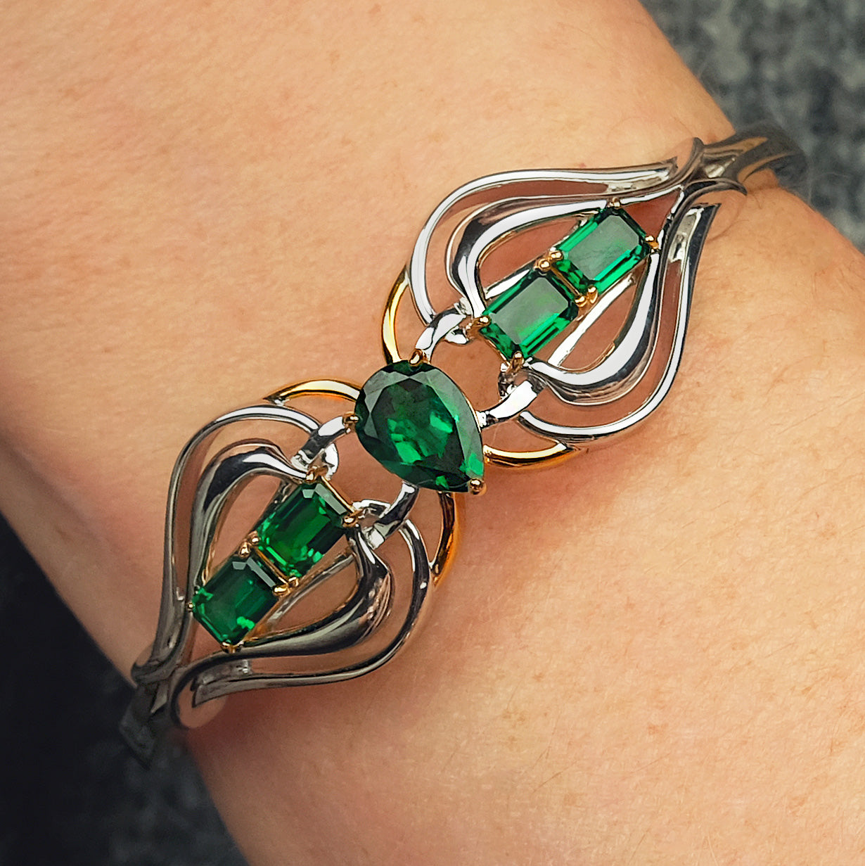 Materials: Sterling Silver, Rhodium and 18k Vermeil (2.5micron), Lab Grown Emeralds (Pear Cut 10mm x 7mm and Emerald Cut 6mm x 4mm)