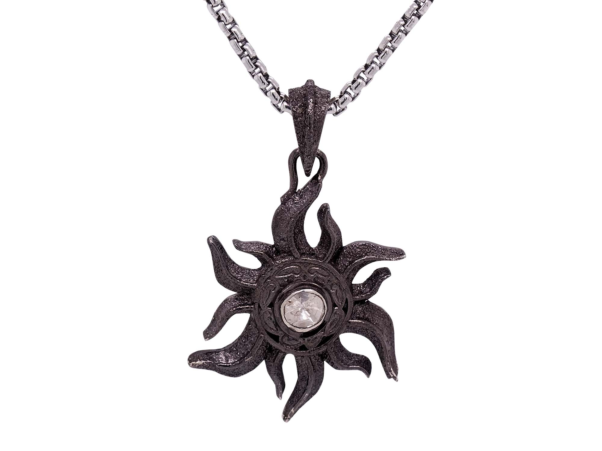 Silver and Black Rhodium Raw Diamond Solar Shield Pendant