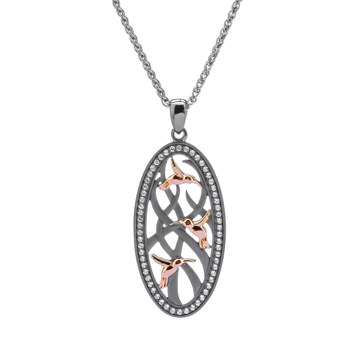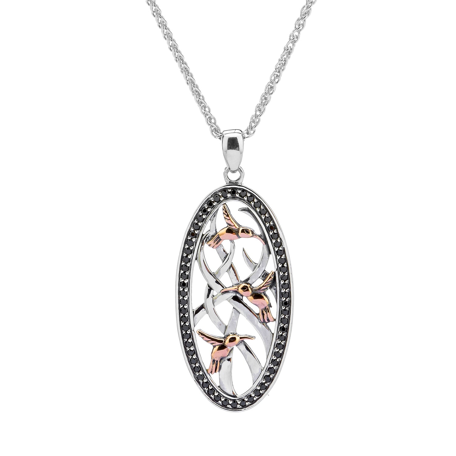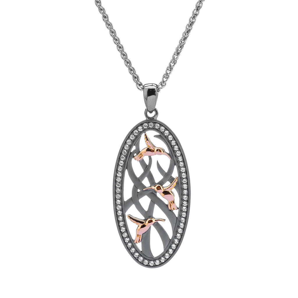 Silver and 10k Rose Gold Triple Hummingbird Pendant - White or Black Cubic Zirconia